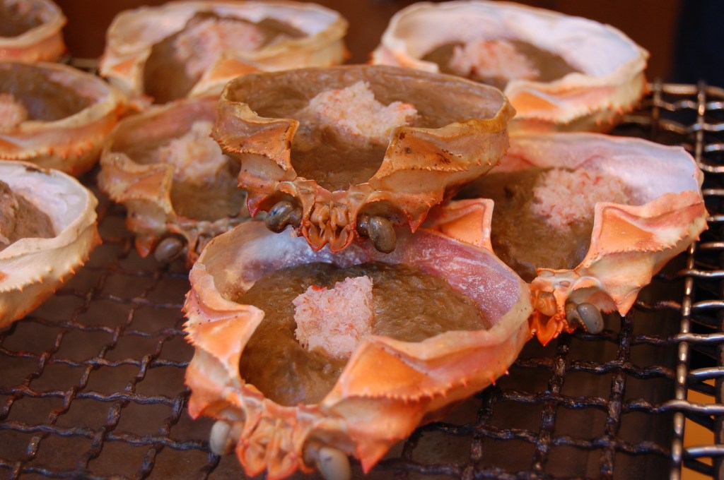 - 蟹味噌甲羅焼き: 甲羅に蟹味噌を入れて軽く焼き、香ばしさをプラス。日本酒を数滴たらしても美味。