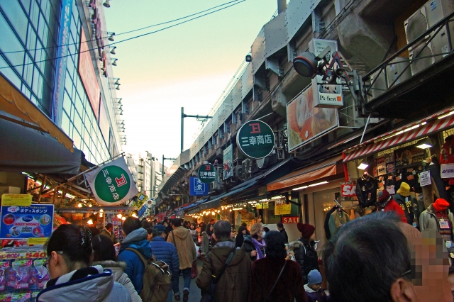 JR上野駅・御徒町駅間の高架下に沿うように伸びるアメ横商店街は、中央改札を出て徒歩3分で到着します。